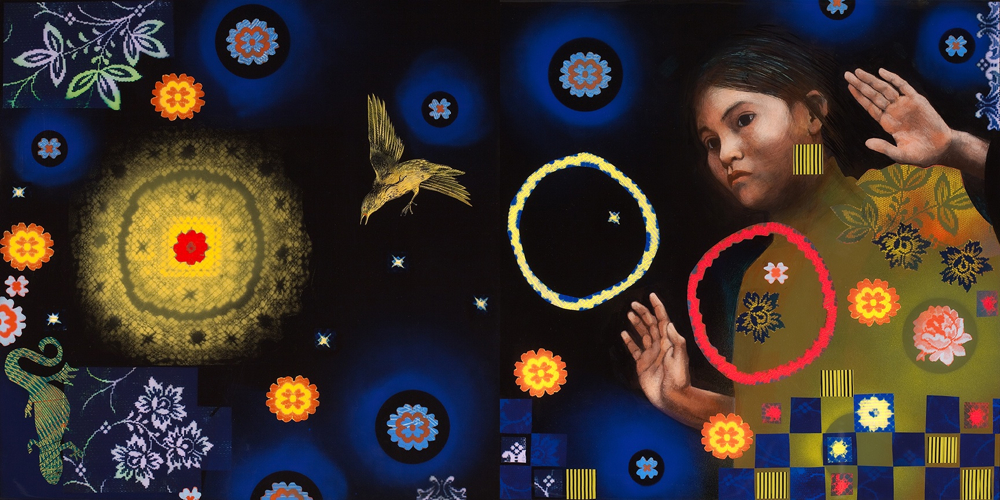 3- Écoute reliée,2011, diptyque, pellicule d'acrylique et résine sur bois, 81 x 162 cm (32''x64'')